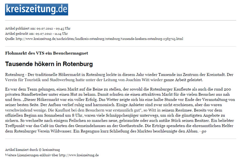 über den Rotenburger Hökermarkt 2012: Flohmarkt des VTS ein Besuchermagnet Tausende hökern in Rotenburg Der traditionelle Hökermarkt in Rotenburg lockte in diesem Jahr wieder Tausende ins Zentrum der Kreisstadt. Der Verein für Touristik und Stadtwerbung hatte unter der Leitung von Joachim Witt wieder ganze Arbeit geleistet. [Artikel der Kreiszeitung "Tausende hökern" als PDF, 45 KB]