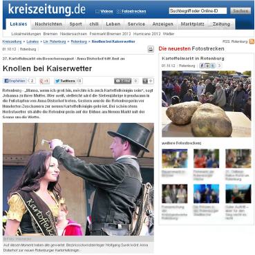 Zeitungsberichte: 01.10.2012 Rotenburger Kreiszeitung "Knollen bei Kaiserwetter" [PDF, 74 KB] 02.10.2012 Rotenburger Rundschau "Rund um die Knolle" [PDF, 37 KB] 03.10.2012 Rotenburger Rundschau "Wer ist eigentlich die neue Kartoffelkönigin?" [PDF, 17 KB]