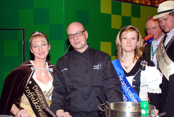 Immer in der ersten Reihe Das hat sich so richtig gelohnt. Nur zwei Tage war Kartoffelkönigin Melanie auf der Grünen Woche und konnte dennoch sehr effektiv Werbung für Rotenburg betreiben. So traf die Majestät zunächst auf Landwirtschaftsministerin Ilse Aigner im Rahmen einer Präsentation der größten Erntekrone der Welt. Wenig später dann war sie zu Gast im Erlebnisbauernhof der FNL und wurde von Fernsehkoch Andreas Völkel zum Kochen eingeladen. Gut 100 Königinnen aus ganz Deutschland war der Einladung des Landwirtschaftsministeriums gefolgt um die riesige Erntekrone zu feiern. Ministerin Ilse Aigner nahm sich die Zeit, alle Majestäten zu begrüßen. Für Königin Melanie waren das sehr beeindruckende Momente, inmitten des Geschehens zu stehen. Auch der gemeinsame Auftritt mit Andreas Völkel, der über Monitore in der Halle 3.2 übertragen wurde, zählte zu den schönen Momenten auf der größten Agrarmesse der Welt.