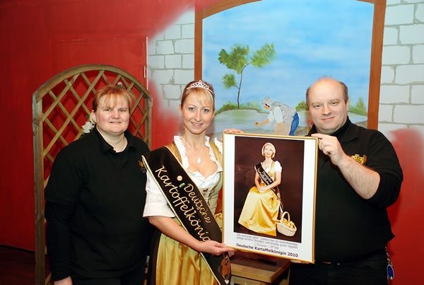 Königin prüft Kartoffelkeller Zufriedene Gesichter gab es jetzt bei Iris Eickhoff und Andreas Hertel. Deutschlands und Rotenburgs Kartoffelkönigin Melanie besuchte den Kartoffelkeller, um sich selbst einen optischen wie kulinarischen Eindruck von dem Restaurant zu verschaffen. Am Ende zeigte die Majestät mit beiden Daumen nach oben und überreichte den Wirtsleuten ein großes Foto mit persönlicher Anmerkung zum Aushang in der gemütlichen Restauration. Schon zeigt längerer Zeit befindet sich im Stadthaus und in den Räumen des SuperBowl der nachträglich eingebaute Betrieb mit vielen Spezialitäten rund um die Kartoffel. Da war es nur selbstverständlich, dass sich Melanie Wölm einmal so richtig mit der Speisenkarte vertraut machen konnte. Der Küchenchef zauberte große Probierplatten mit den leckersten Gerichten aus und um die Kartoffel. Dazu gab es natürlich auch einen gut gekühlten Kartoffelschnaps. Königin Melanie ist die zweite Majestät, die nun auf einem Großfoto im Kartoffelkeller zu bestaunen ist. Sicher wird auch ihre Nachfolgerin Anfang 2011 den Weg in das gemütliche Restaurant finden und ihre Visitenkarte dort abgeben. Auf jeden Fall werden am 26. September alle Gastköniginnen des Kartoffelmarktes ihre Mittagspause im Stadthaus machen und sich an einem köstlichen Bufett stärken. Bis dahin bastelt der Küchenchef an weiteren Leckereien und freut sich über jeden knolligen Hinweis aus der Bevölkerung.