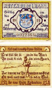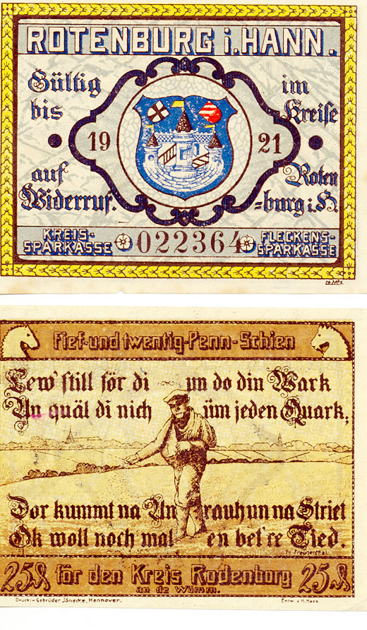Rotenburger Zehner für zwei Ratefüchse War die Frage des Vereins für Touristik und Stadtwerbung (VTS) am Ende doch zu schwer? Ganz einfach sollte es den Lesern des Rotenburger Journals ja aber auch nicht gemacht werden. Bis zum Einsendeschluss gingen dann aber doch noch zwei richtige Lösungen ein. Also, das kleine Gedicht "Lew´still för di" stammt von Friedrich Freudenthal und gedruckt wurde es auf einem "Fief-und twentig-Penn-Schien för den Kreis Rodenborg". Dabei handelt es sich um einen sogenannten Notgeldschein aus dem Jahre 1921 mit einer Gültigkeit "bis auf Widerruf". Heinz G. Gehnke vom InfoBüro der Stadt Rotenburg, der einige dieser Scheine besitzt, war doch recht erstaunt, dass nicht mehr richtige Lösungen eingingen. Selbst "de Vörsitter" der Freudenthal-Gesellschaft aus dem benachbarten Soltau musste passen. Er schrieb "Die Verse sind mir noch nicht begegnet. Ich gebe Ihr Schreiben an das Institut für niederdeutsche Sprache in Bremen weiter!" Gehnke hat Dr. Heinrich Kröger zwischenzeitlich mit einem Schein versorgt , Post aus Bremen ist aber noch nicht eingetroffen. Zwei Journal-Leser haben die richtige Lösung gewusst, auf Postkarten geschrieben und an das InfoBüro gesandt. Als Belohnung erhalten nun Walter Schnackenberg aus Rotenburg und Heinz Hüttmann aus Westerwalsede je einen Rotenburger Zehner zum Einkaufen in der Kreisstadt. Weiter legt der VTS noch einen Rotenburger Glückstaler mit in die Post. Und weil ja noch ein weiterer Zehner im Jackpott liegt, packt der VTS zwei weitere hinzu und möchte nun wissen: "Welche Jahreszahl wurde auf gültige Münzen für den Kreis Rotenburg geprägt?" Wer die Antwort weiß, hat schon so gut wie einen von drei Rotenburger Zehner gewonnen. Einsendeschluß ist Montag, der 12. April 2010 um 12 Uhr. Der Rechtsweg ist ausgeschlossen. Die Anschrift: VTS-Rätsel, Große Straße 1, 27356 Rotenburg (Wümme) oder per E-Mail oder auf www.rotenburger-zehner.de.