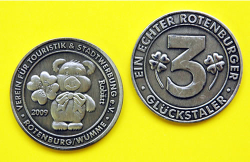 Rotenburg hat jetzt seinen Talisman Wer wünscht es sich nicht ein kleines Stück vom großen Glück und das zu allen nur möglichen Anlässen? In Rotenburg (Wümme) scheint das jetzt käuflich zu sein. Das zumindest behauptet der neu gegründete "Verein für Touristik und Stadtwerbung" (VTS). Ab sofort ist in der Kreisstadt der erste echte "Rotenburger Glückstaler" zu haben. Der Verkauf der grafisch gelungenen Medaille hat begonnen und wie es sich für einen Taler gehört, ist er für nur drei Euro zu bekommen.